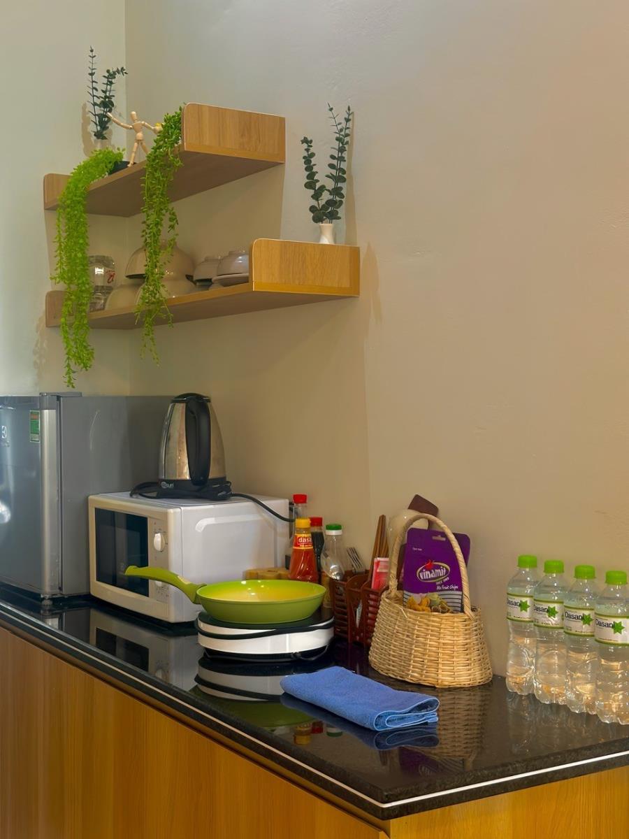 Bếp đủ dụng cụ: Bếp từ, nồi niêu, bát đĩa – nấu ăn như ở nhà.